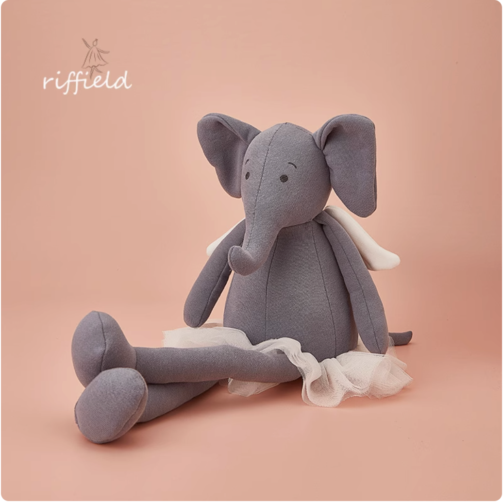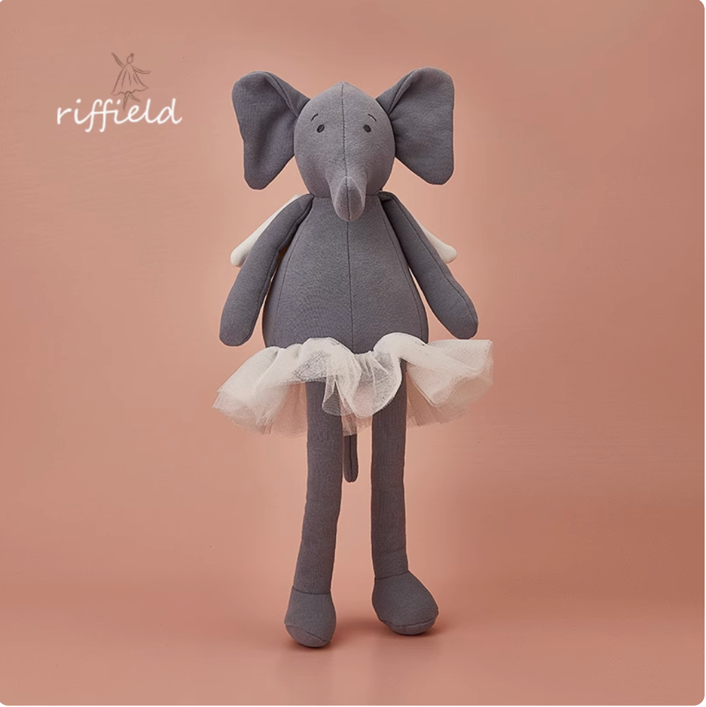 This adorable Riffield gray elephant toy in a white gauze skirt is the perfect addition to any child's playroom. The soft and cuddly design promotes imaginative play, while the white gauze skirt adds a touch of whimsy. Give the gift of joy and creativity with this delightful doll.